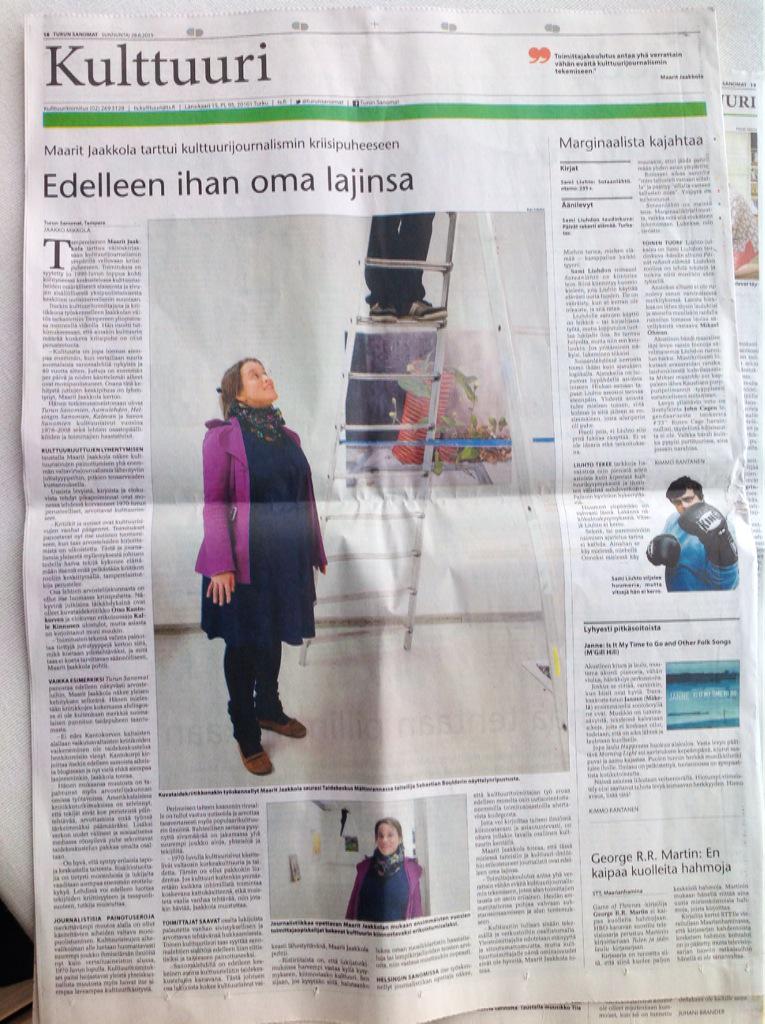 “Maarit Jaakkola tarttui kulttuurijournalismin kriisipuheeseen: Edelleen ihan oma lajinsa” [Maarit Jaakkola took up the crisis discourse of cultural journalism: Still a discipline in its own right] by Jaakko Mikkola, Turun Sanomat 28.6.2015.